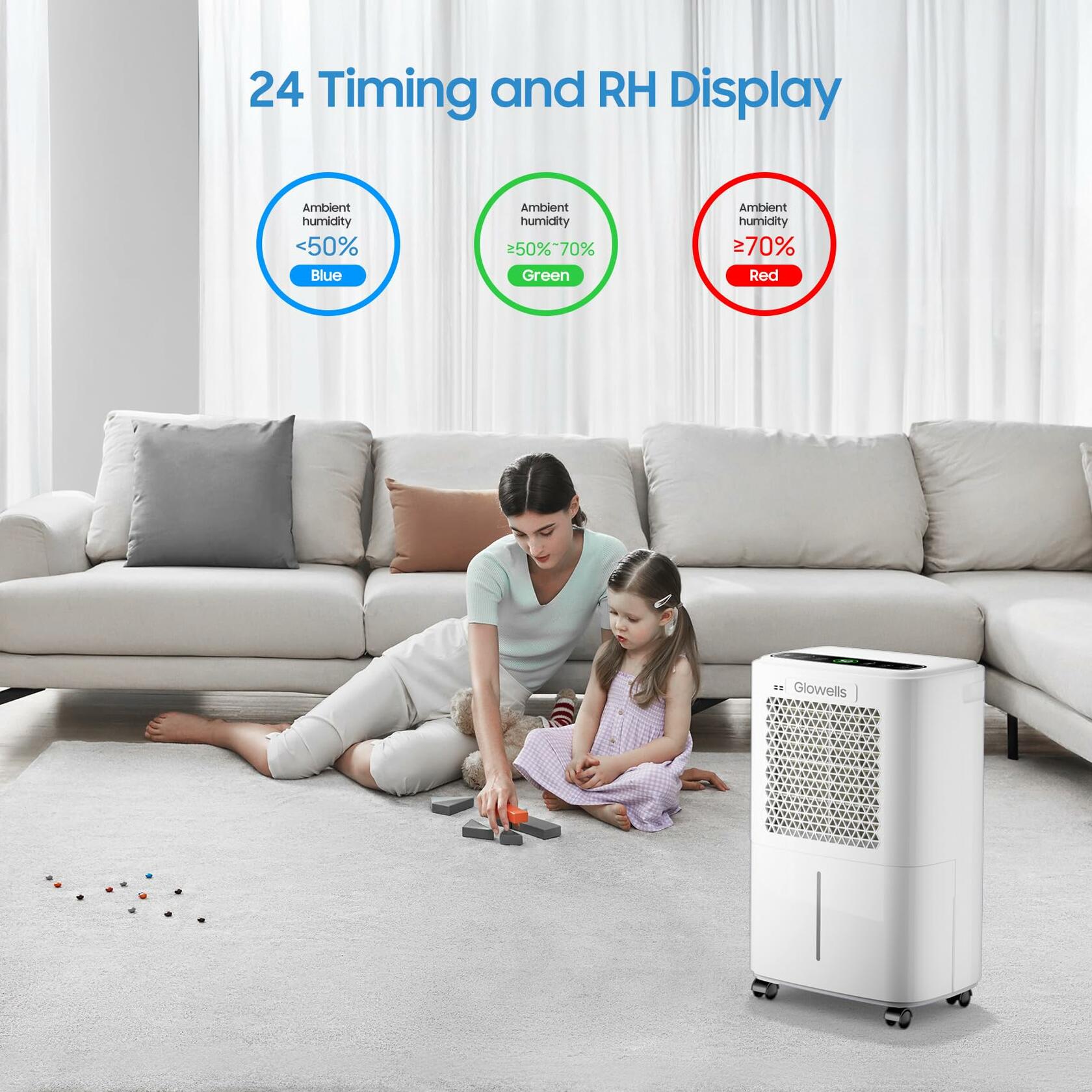 - Smart Dehumidifier & Easy Operation - The Glowells home dehumidifier features advanced chips and intelligent humidity control. When the humidity reaches the preset level, the dehumidifier will automatically stop; when the humidity exceeds the set value, the dehumidifier auto star to maintain a comfortable range. Simply touch the buttons to control humidity, set a timer, adjust fan speed, etc. The intuitive interface and easy-to-read display screen make it user-friendly