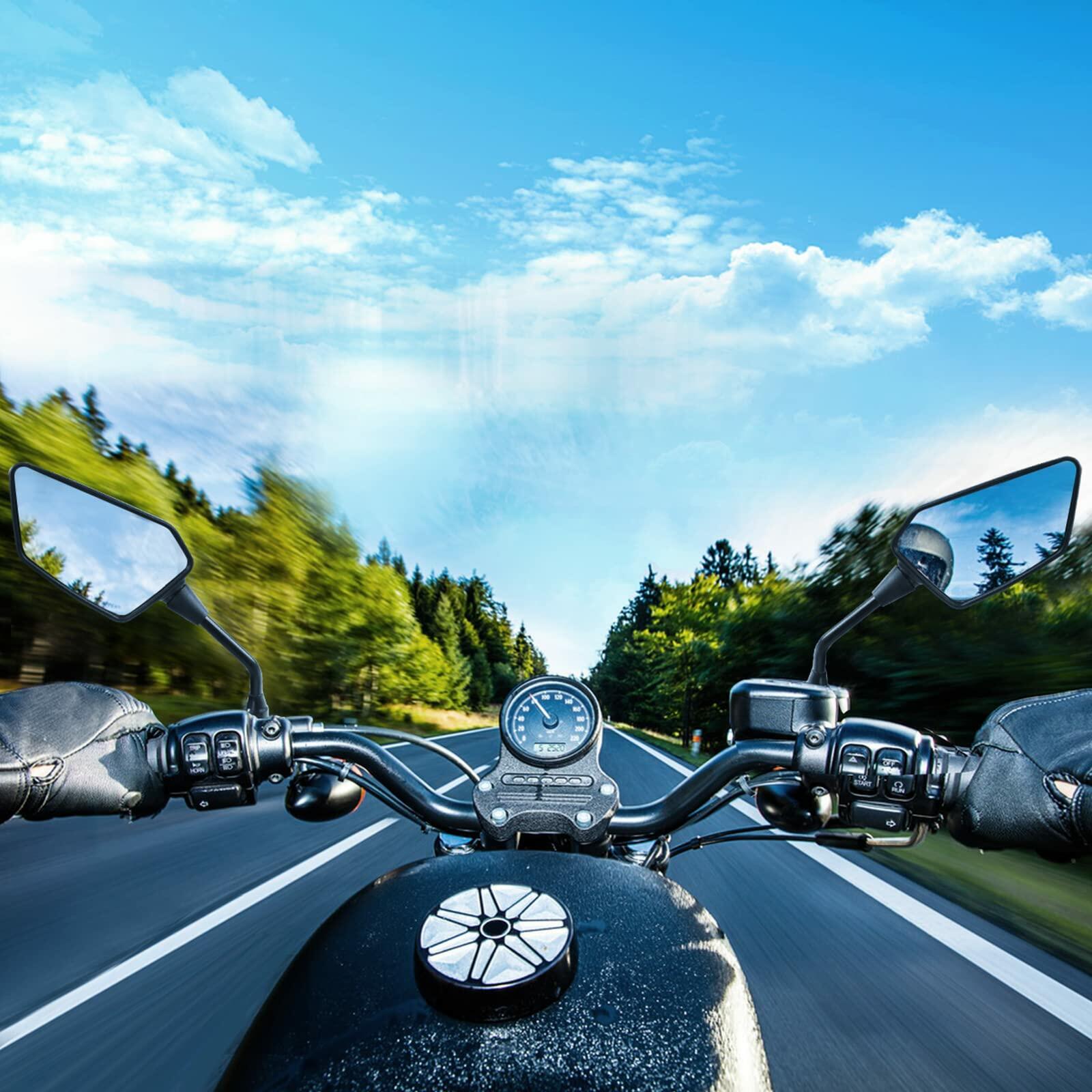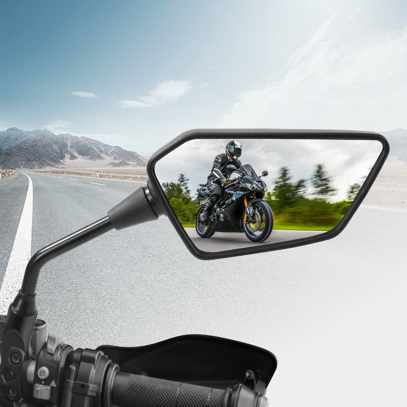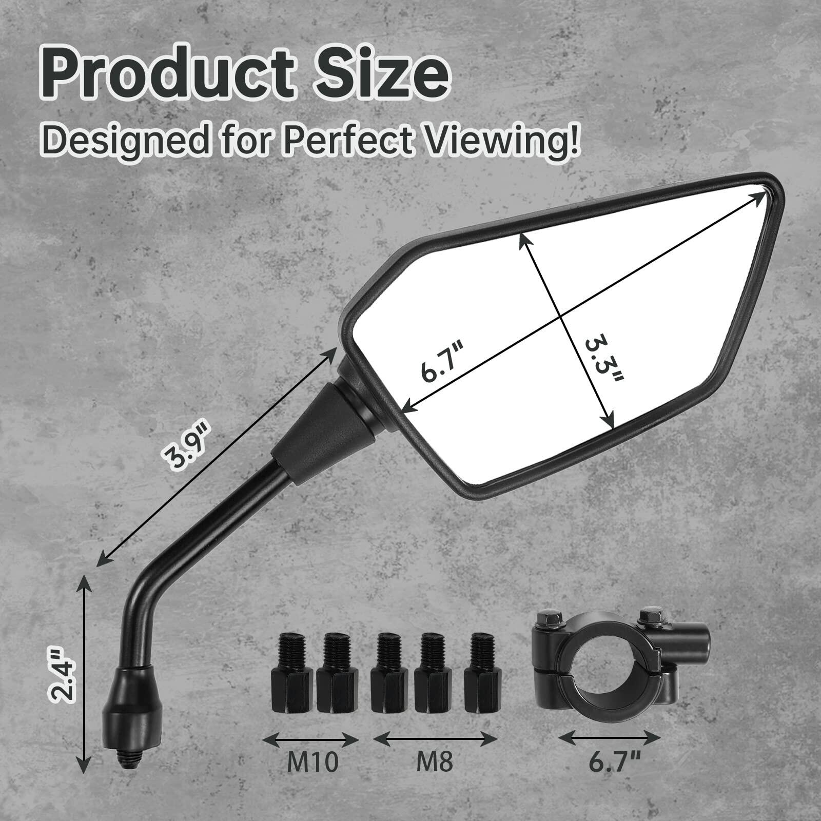 - [Easy Installation]These mirrors are equipped 2 x Motocycle Mirrors, 5 x bolts( 1 x 10MM counter thread screw, 1 x 10MM clockwise thread screw, 2 x 8MM clockwise thread screw, 1 x 8MM counter thread screw), 2 x 7/8" handlebar mount clamp
