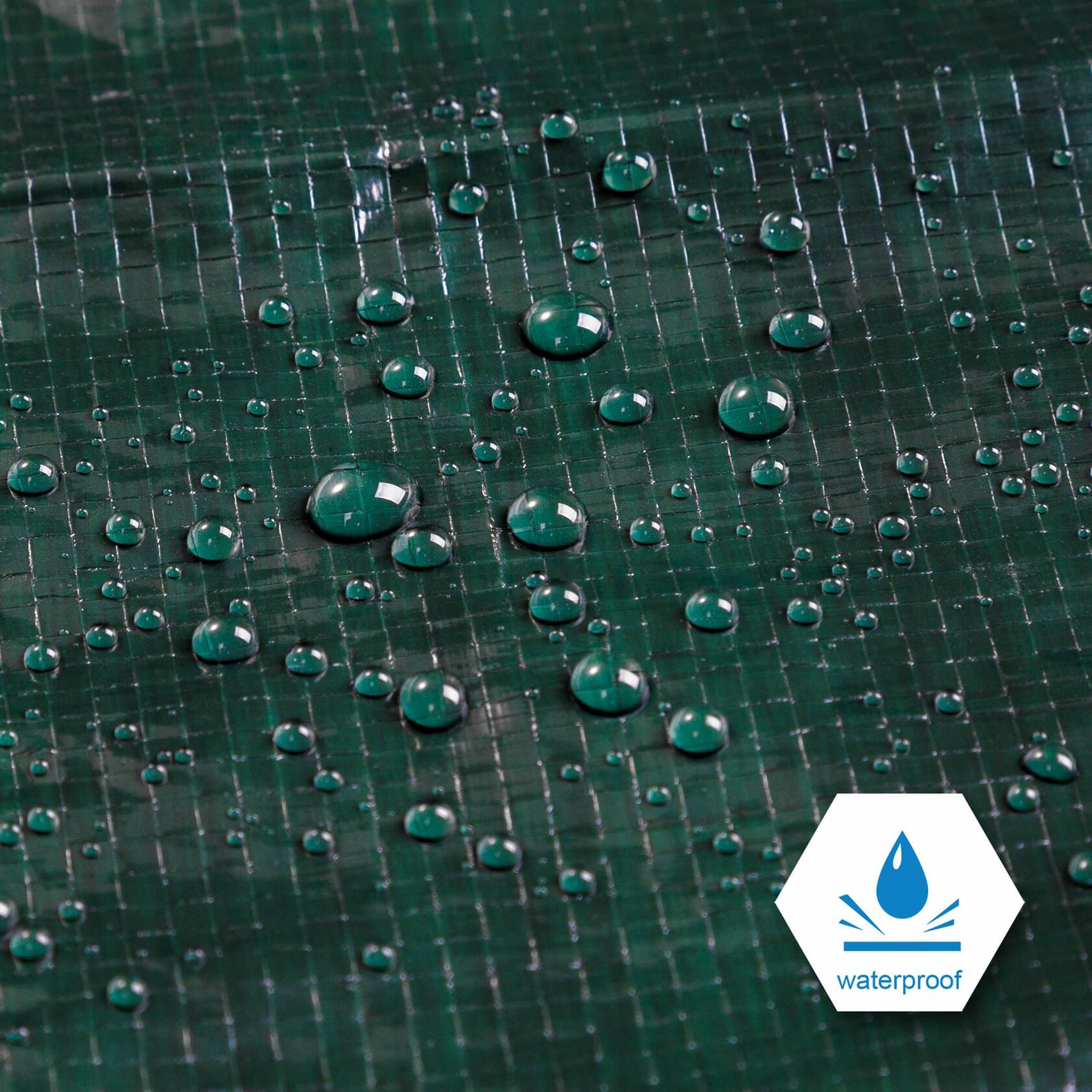 PRODUCT FEATURES GREEN Polyethylene Size: 8x10ft Water, Weather, and Tear Resistant Rustproof Provides Great Coverage for Cars, Benches, Pools, Heavy Equipment & Machinery and More HIGH QUALITY COVERAGE The tarps are made with the highest quality polyethylene, which is a form of plastic that is extremely strong and heavy duty. It is lightweight yet durable simultaneously which is an excellent quality, it is crafted to be extremely durable. Works amazingly well in the outdoors - backyards, gardens, patios, lawns, roofs, construction sites and more! Keep your vehicles, benches, tables, grills, and other belongings safe from harsh weather conditions when heavy rain and blizzards come around. Rustproof grommets on the edges every 36 inches so you can easily tie it down on a surface.