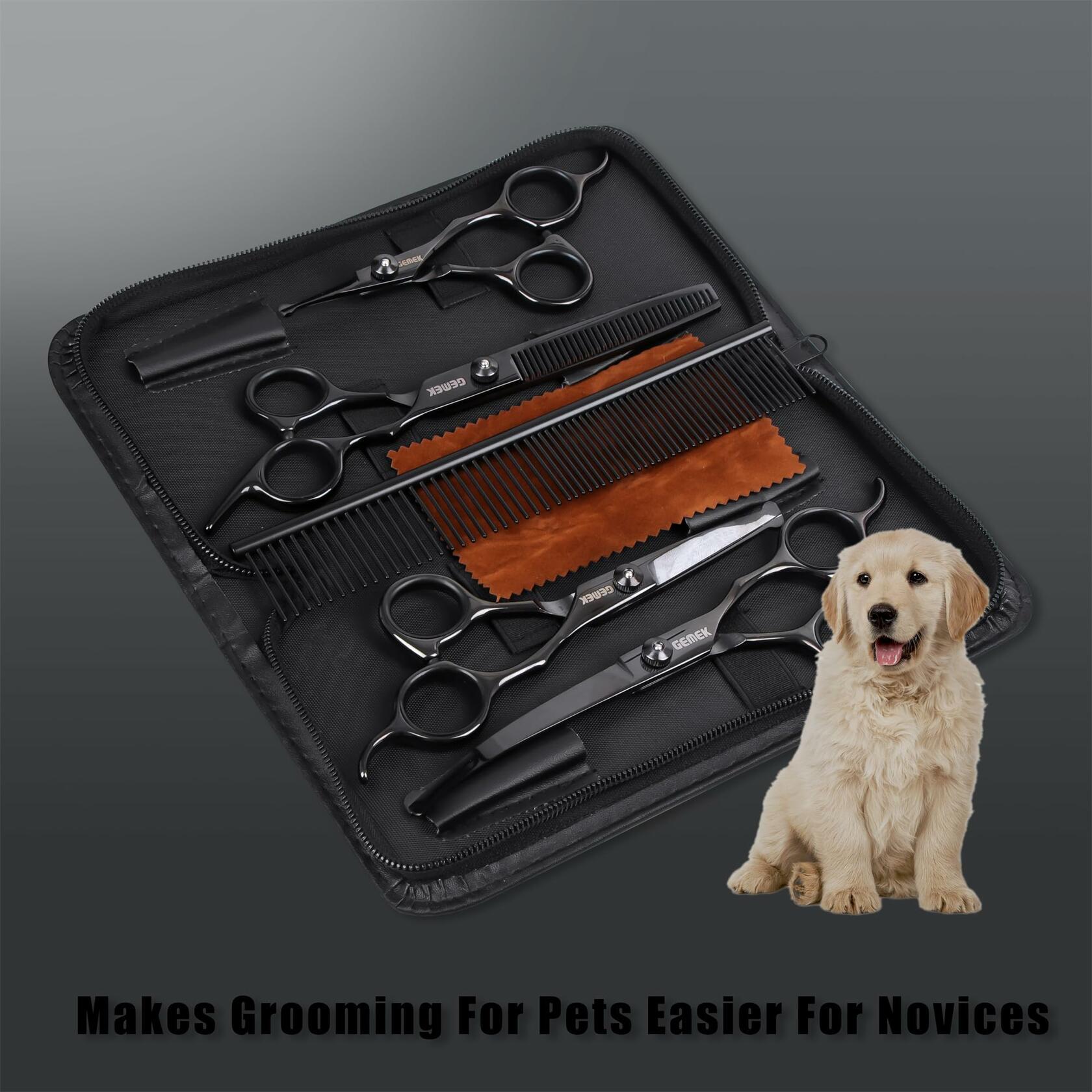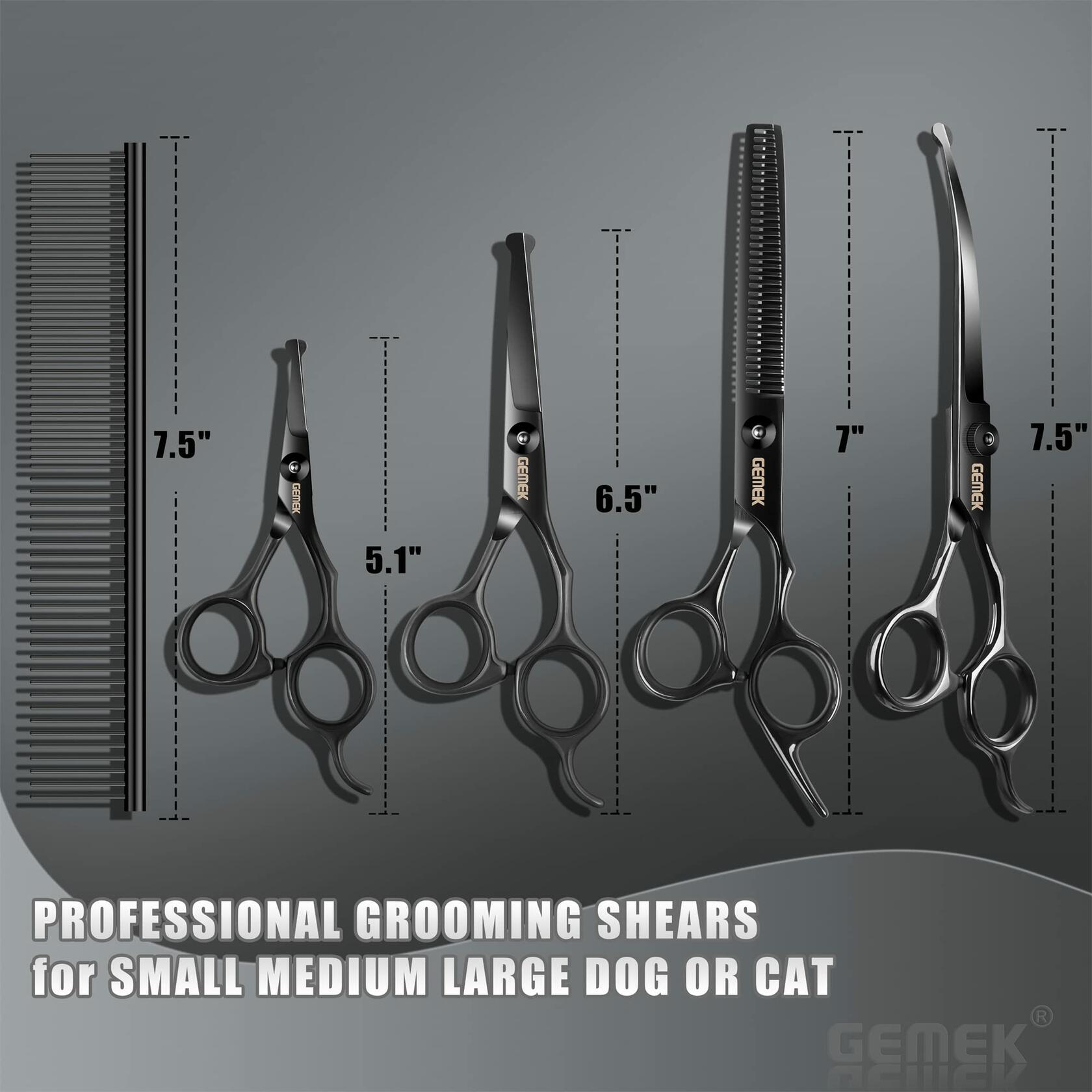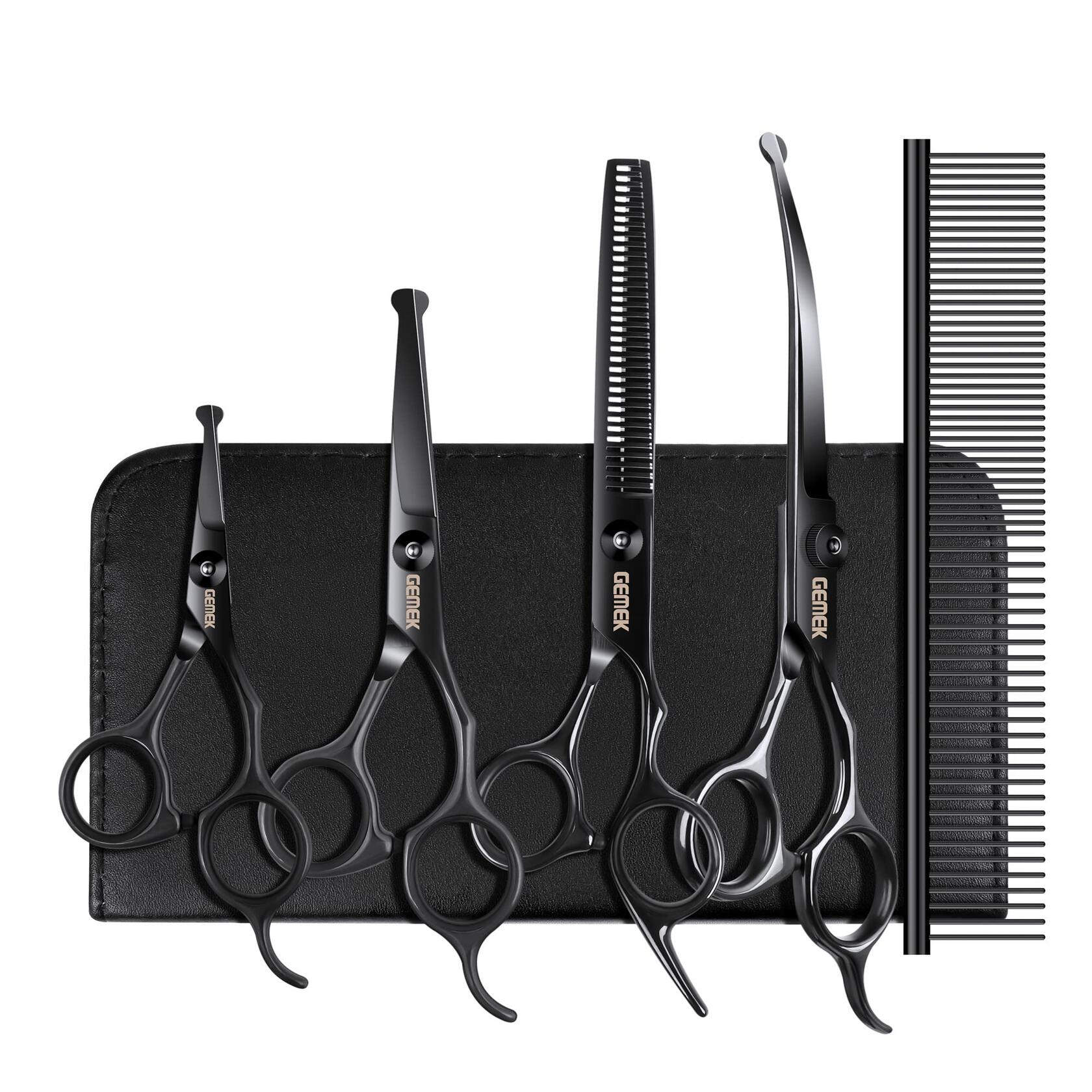 Dog Grooming Scissors Kit with Safety Round Tips, GEMEK Professional 6 in 1 Grooming Scissors for Dogs, Heavy Duty Titanium Coated Pet Grooming Scissor for Dogs, Cats and Other Animals (Black)