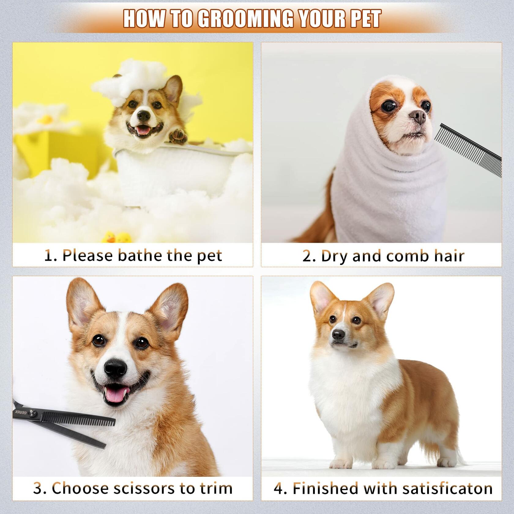 - ✔【Round Tipped Ends Design More Safety】Safety round tip that keep pets safe, never need to worry about poking your pet's skin, especially in sensitive areas such as the eyes and ears. whether professional pet groomer, hairdresser or novice, you can easily and safely use this pet scissors to trim body hair or face hair for your dogs, cats and other pets. You can become a professional beautician at home, saving time and money, never worry about accidental injury.