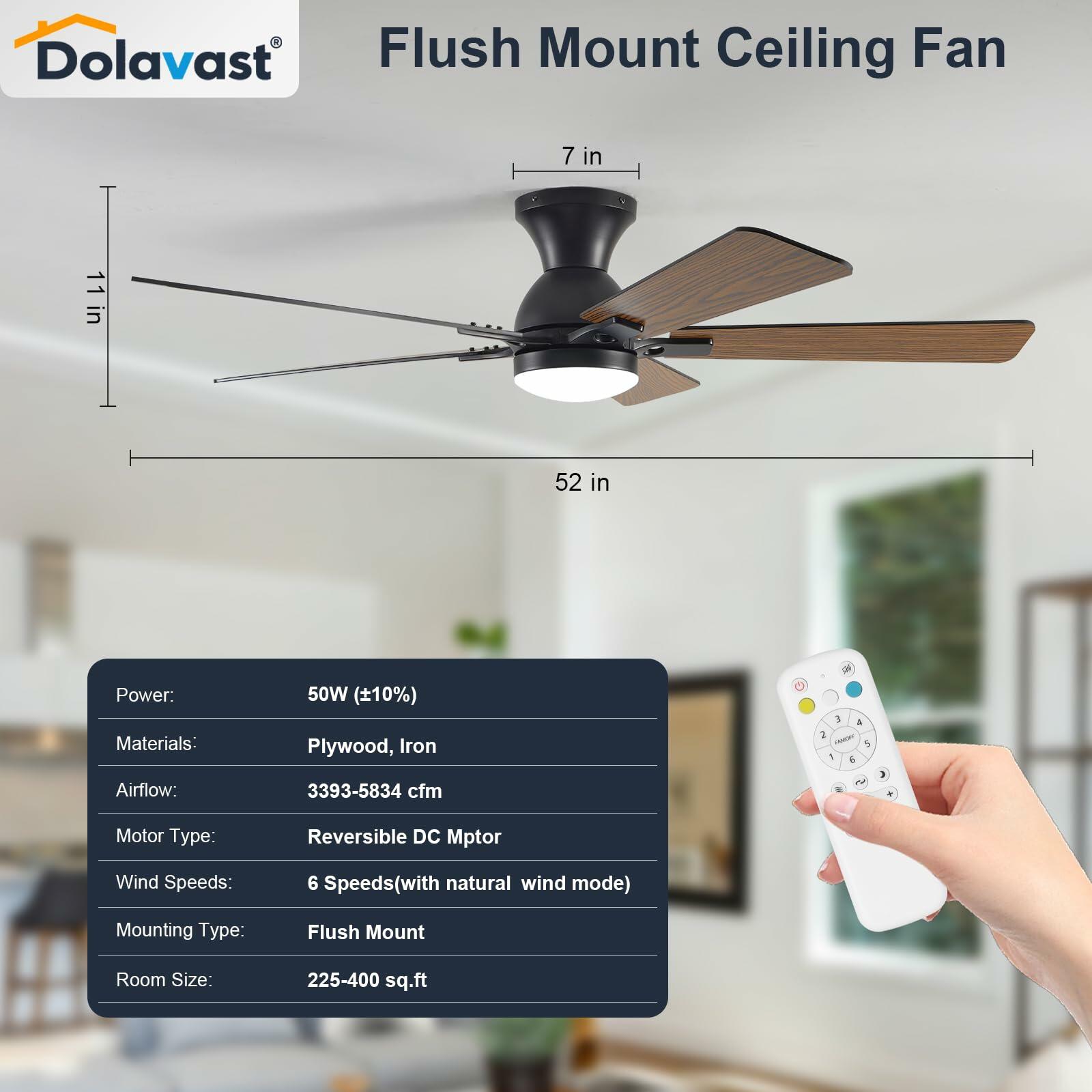 Dolavast Ceiling Fans with Lights, 52 Inch Low Profile Ceiling Fan with Light and Remote Control, Flush Mount, Reversible, 3CCT, Dimmable LED, Quiet, Black Ceiling Fan for Bedroom, Living Room