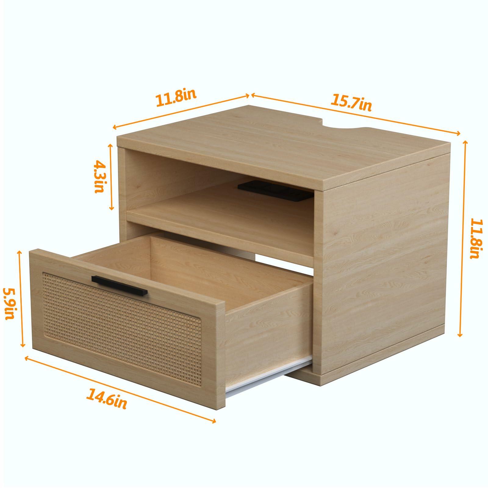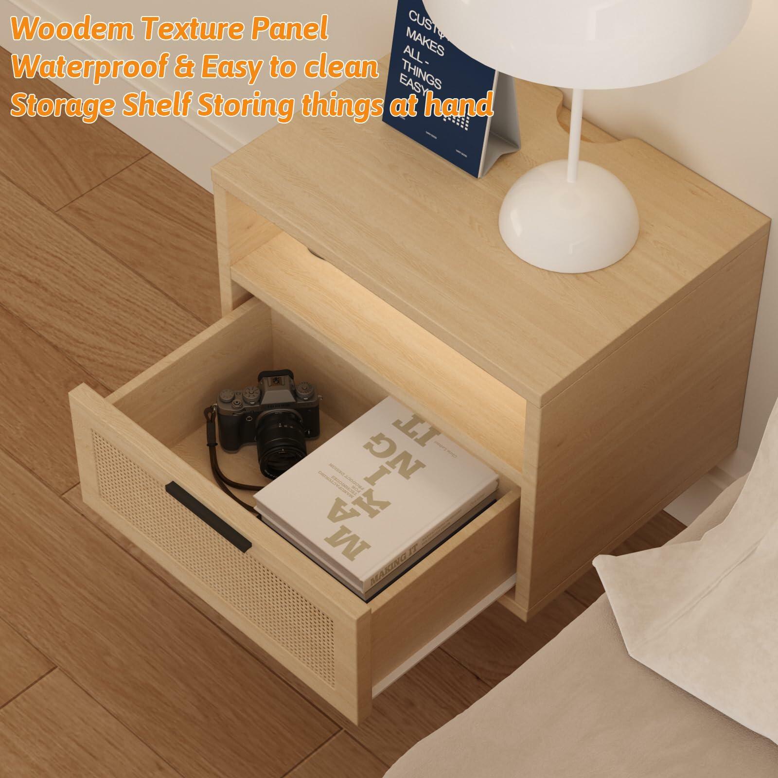 - Perfect Blend of Modern Design and Functionality: Our floating nightstand features a rattan design with a modern bohemian style, adding a touch of elegance to any room. It comes equipped with 2 AC power outlets and 2 USB ports for convenient device charging. The spacious drawer is perfect for storing decor, electronics, and other essentials, keeping your space neat and organized. Its space-saving floating design not only enhances the room’s functionality but also provides more room for movement and a sleek, streamlined look.
