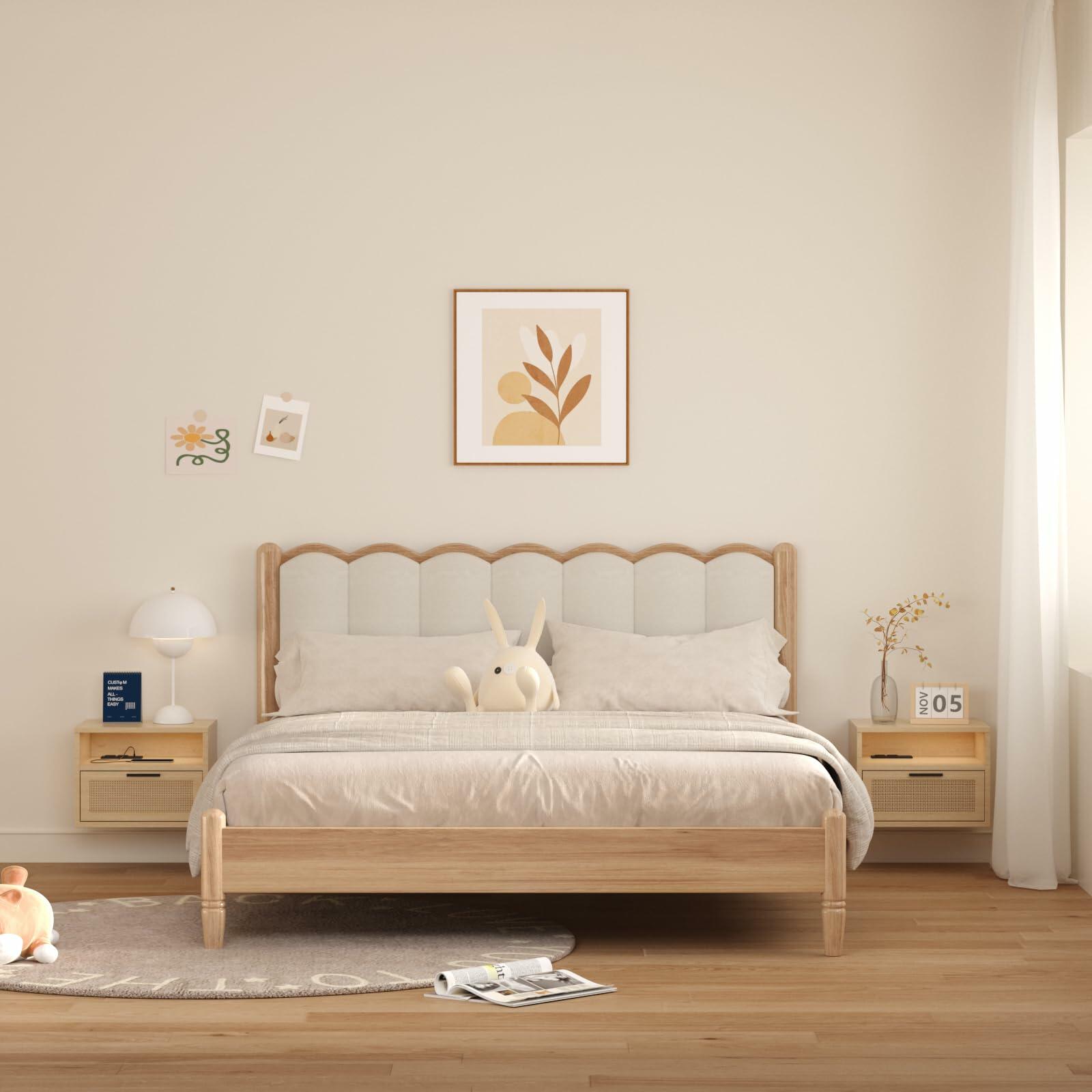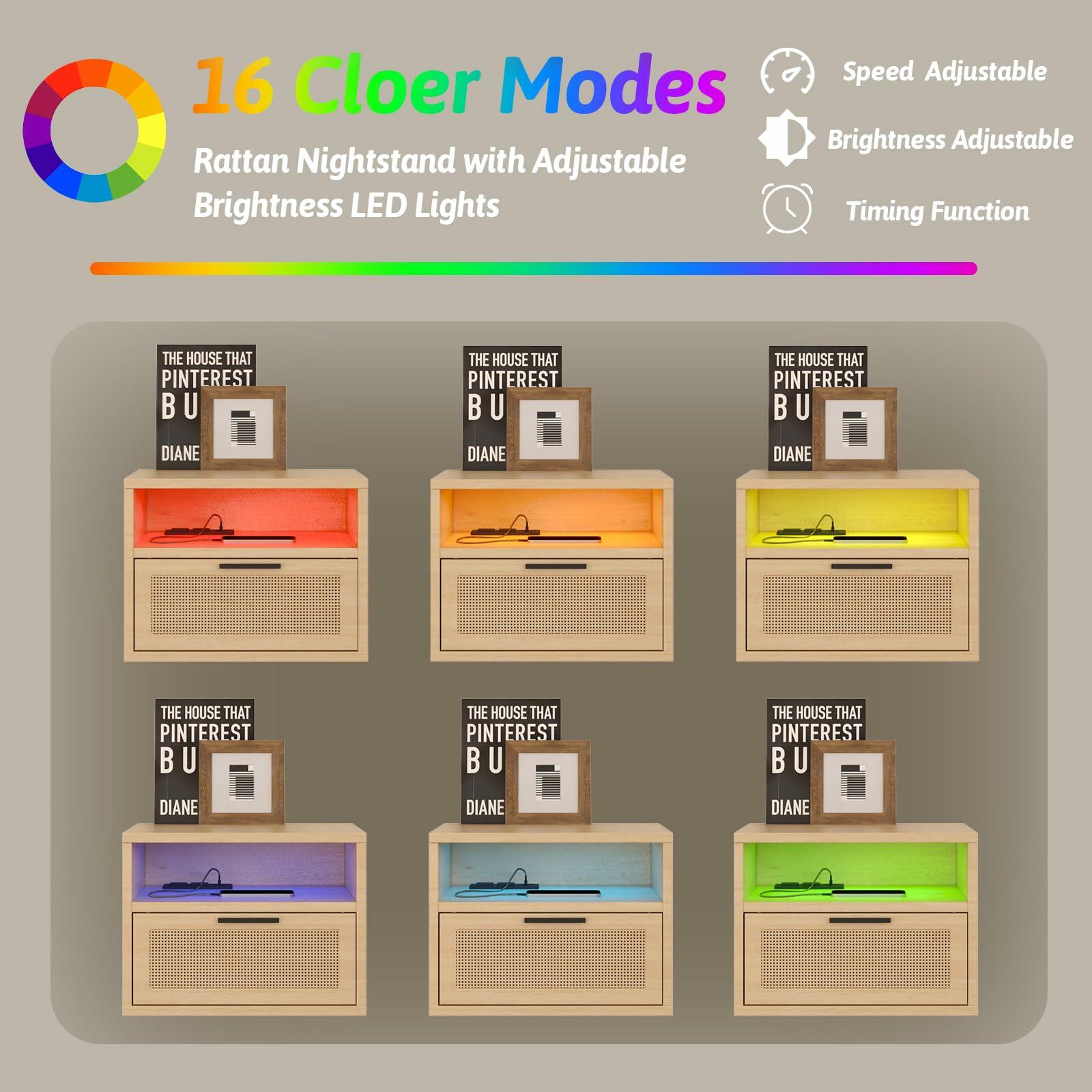 floating nightstand set of 2 with USB Ports, Outlets, and LED Light Strip – Modern Wall-Mounted Nightstands with Oak and Rattan Design