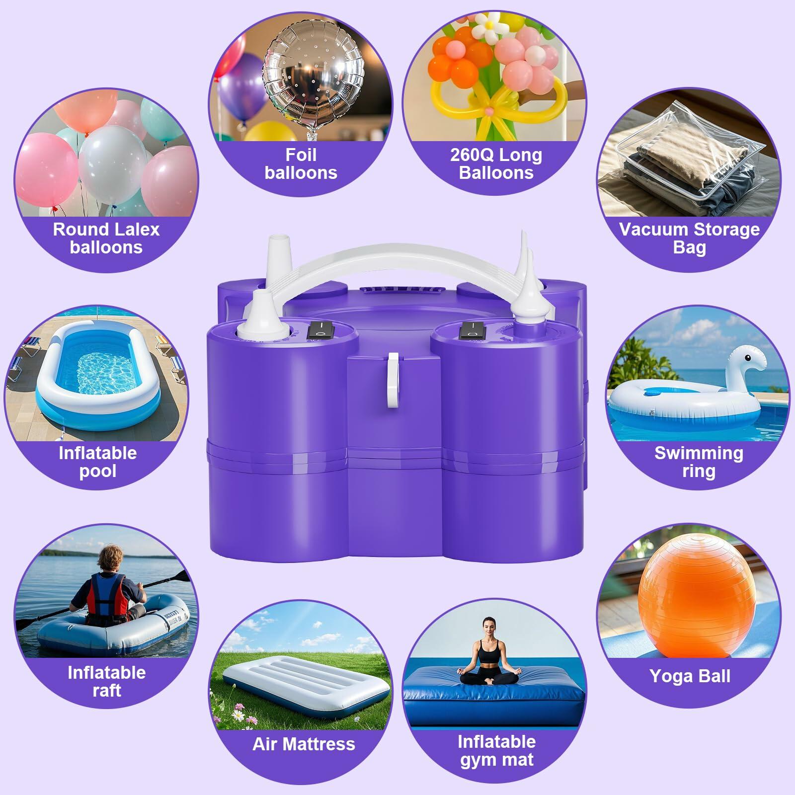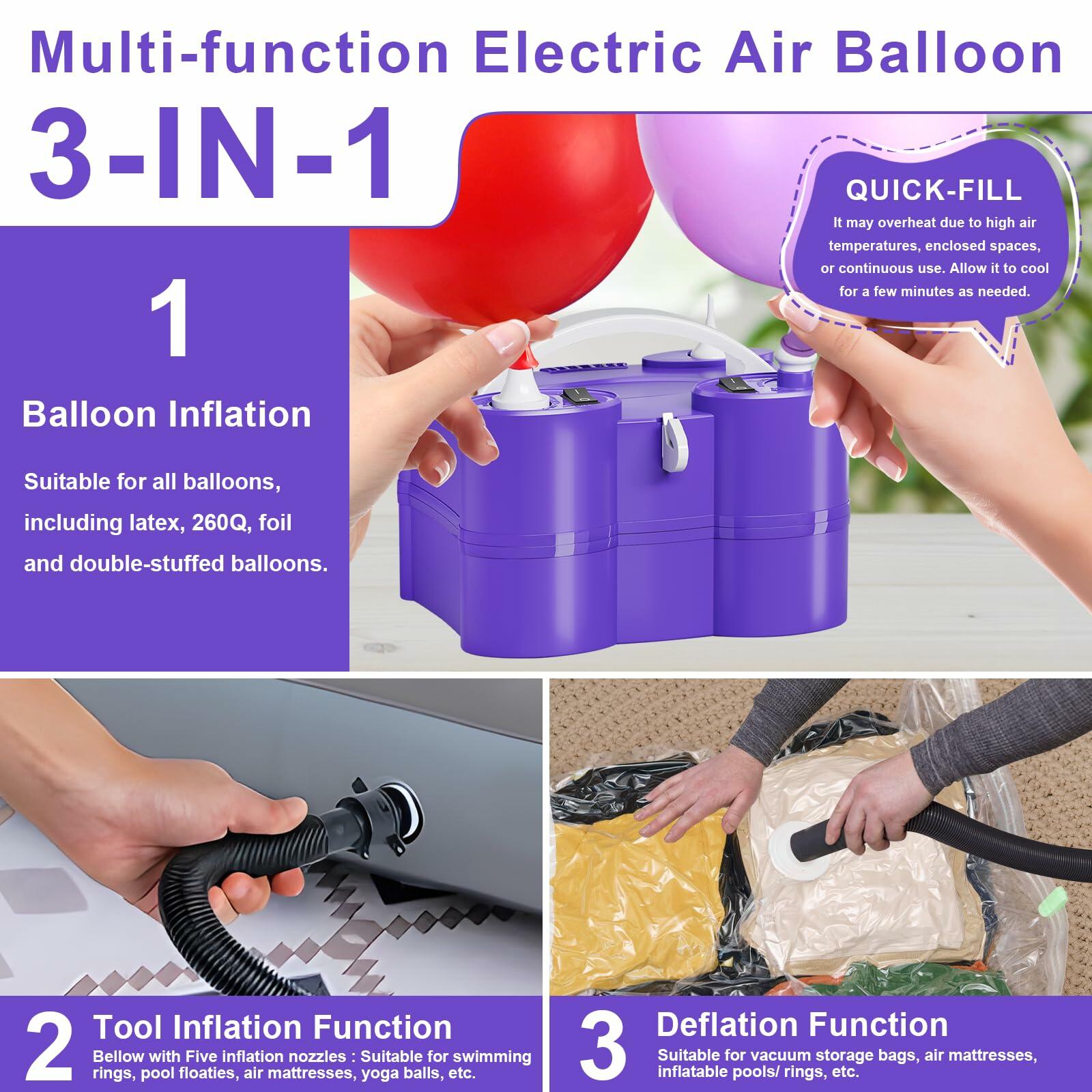 FLSEPAMB Electric Balloon Pump, 3-in-1 Portable Electric Air Balloon Blower Machine Balloon Pump 2 Motor Dual Nozzle Balloon Inflator for Latex 260Q Long Foil Balloons Swimming Rings Air Beds (Purple)