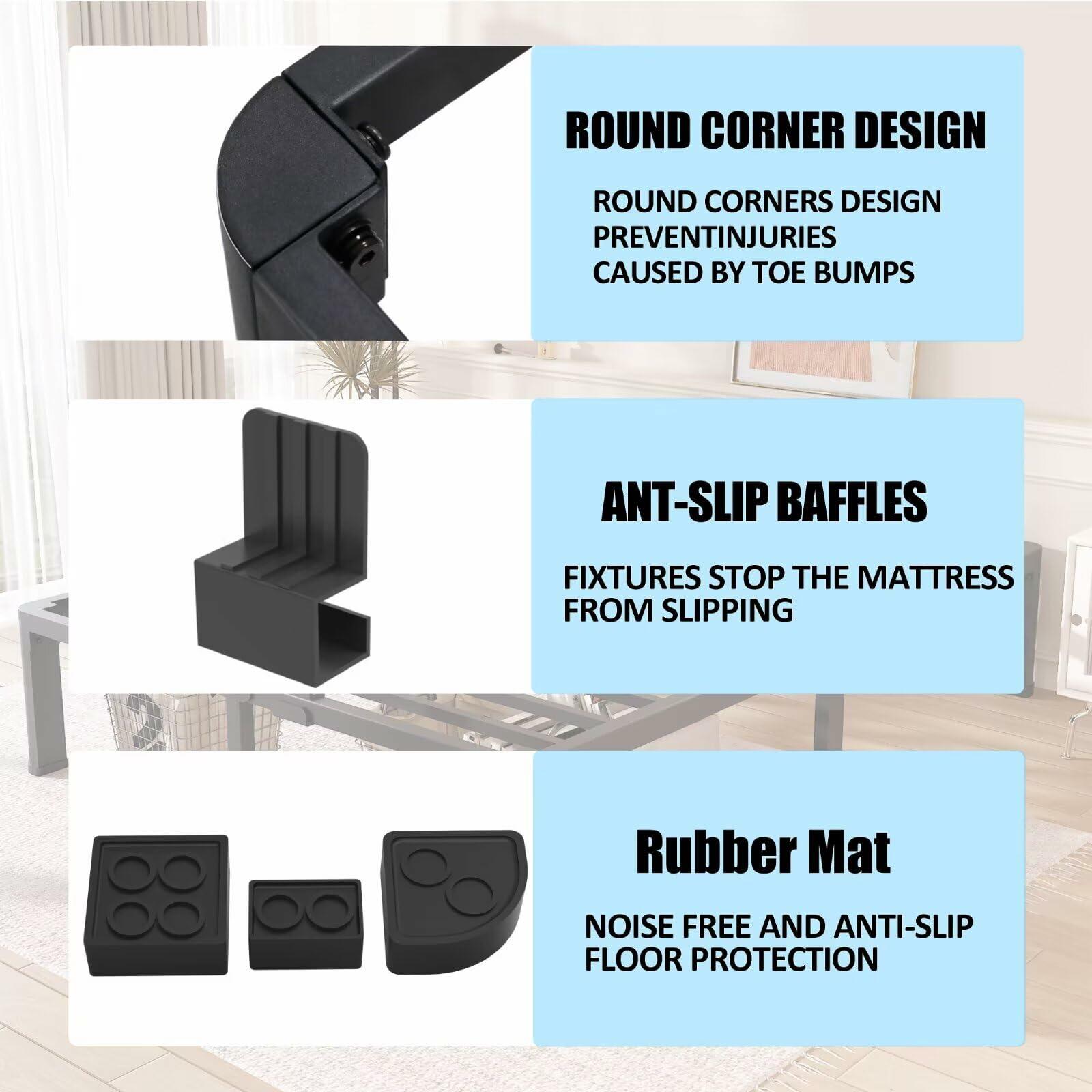 Rouned Corner Legs and Headboard Hole Legs. Anti-slip Rubber Pads. Four Mattress Stoppers. The metal bed frame is easy to install, with clear step-by-step instructions to help you easily assemble.Storage space: This metal bed frame allows you to maximize the space in your bedroom.
