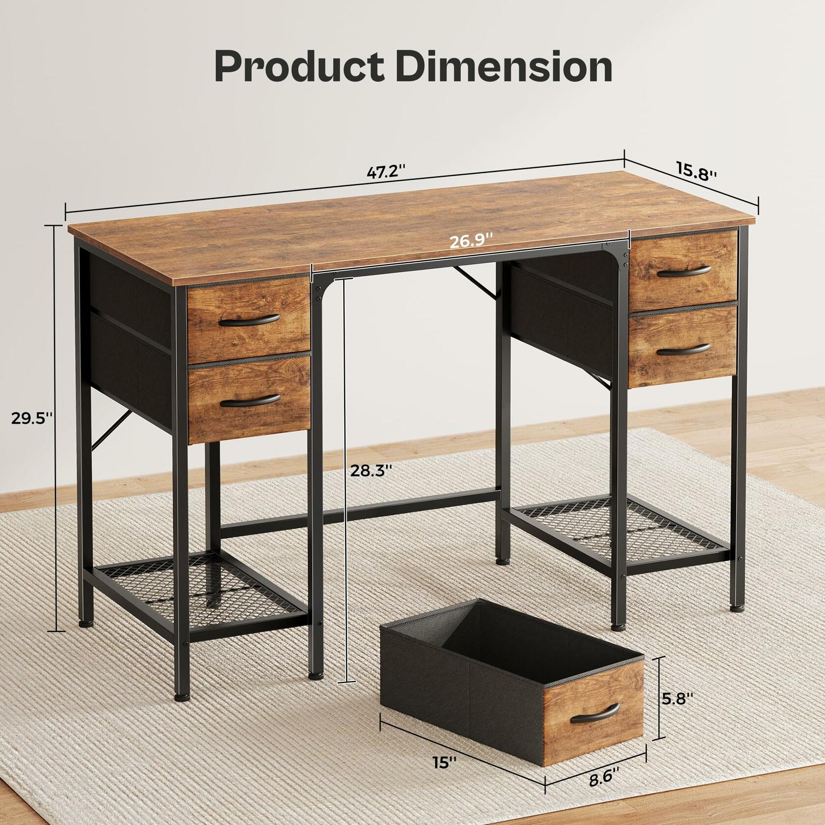 Are you looking for the perfect addition to your home office? Our multifunctional gamer desk is designed to meet your everyday needs while enhancing your workspace. Featuring 4 spacious drawers, this writing desk with drawers helps you keep your office supplies, important documents, and personal items neatly stored and easily accessible. The customizable drawer layout allows you to install the drawers on either the left or right side, ensuring the office desk with drawers fits perfectly into your room and caters to your specific preferences. Boasting a sleek design with rustic brown desktop and black metal leg, this work desk can be a fit into any home decor. Its versatile style makes it ideal for various uses, whether as a desk for home office, gamer desk, home desk, or study room. Built with a sturdy metal frame, durable particleboard, and fabric dresser, it supports all your essentials reliably. The adjustable feet ensure stability on any floor surface, making this a robust choice for daily activities. Plus, with clear instructions, numbered components, and all necessary tools included, assembly is a breeze, so you can enjoy your new workspace in no time.