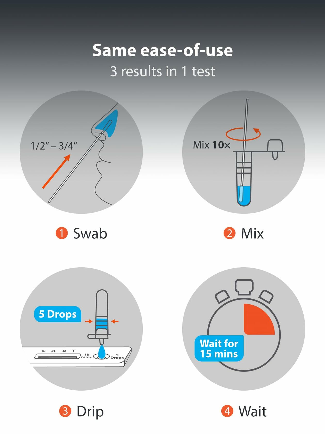 - Same Ease-of-Use; Get 3 Results in 1 Test: Utilizing the familiar 4 user-friendly steps of at-home COVID tests, you can now get all 3 results for COVID-19 and Flu A & B at once with 5 drops of sample.