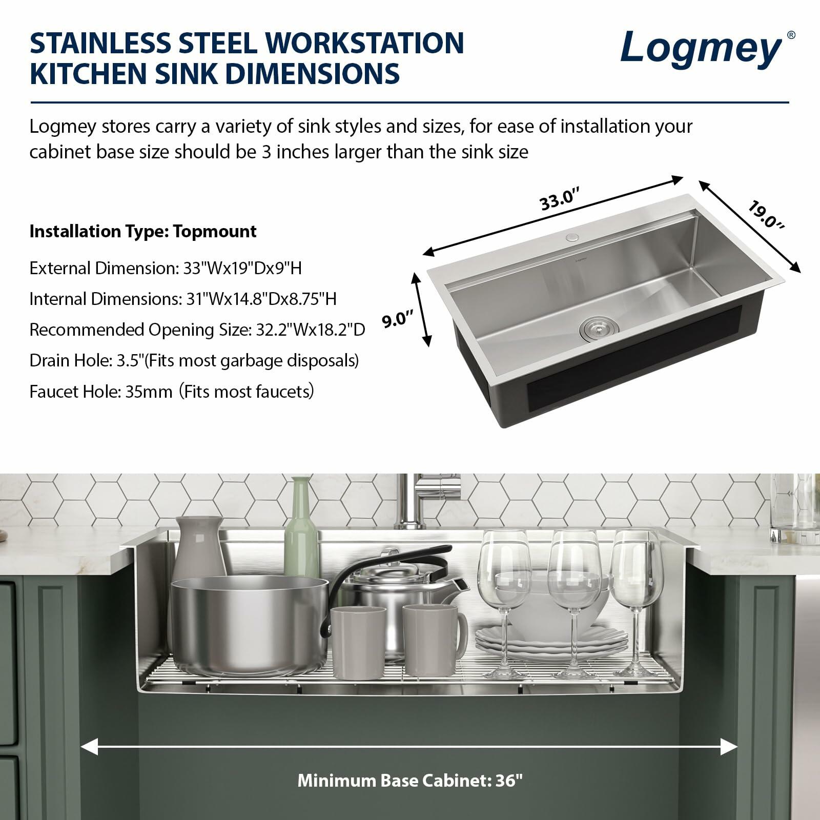 - ▶SOLID CONSTRUCTION: Logmey 33x19 drop in kitchen sink is constructed of heavy duty 16 gauge SUS304 stainless steel. Drop in workstation sink with commercial-grade brushed finish resists dents and scratches, is easy to clean and has a long service life.