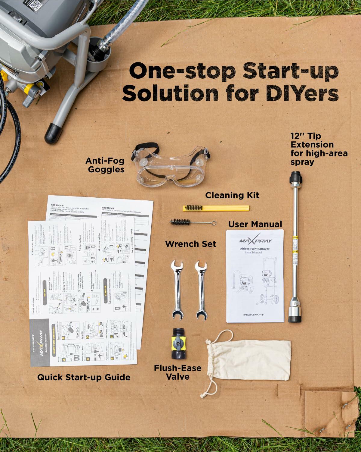 - Accessories for a Comfortable & Safe Painting Experience - Reduce strain on your back with the 12" tip extension, allowing you to easily reach high areas. Protect your eyes from atomized paint with anti-fog goggles, and quickly clean the spray gun with the included cleaning kit. Ensure a leak-free experience by tightening joints with the wrench set.