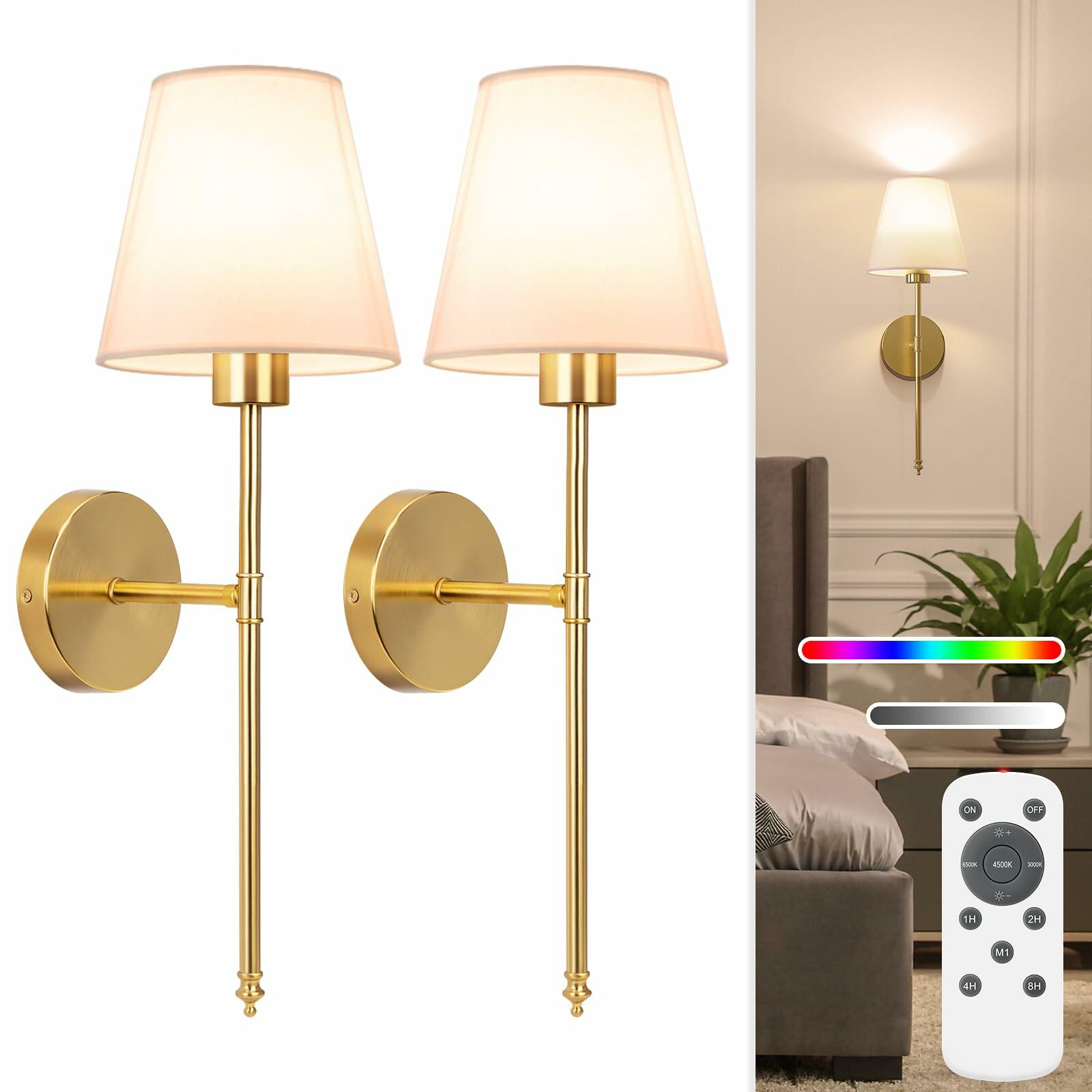 NIORSUN 19.9 inch Battery Operated Wall Sconce Set of 2,Gold Rechargeable Wall Lights with 5200mAh Dimmable Detachable Bulbs and Remote,10 Colors Wireless Sconces for Bedroom Living Room Hallway