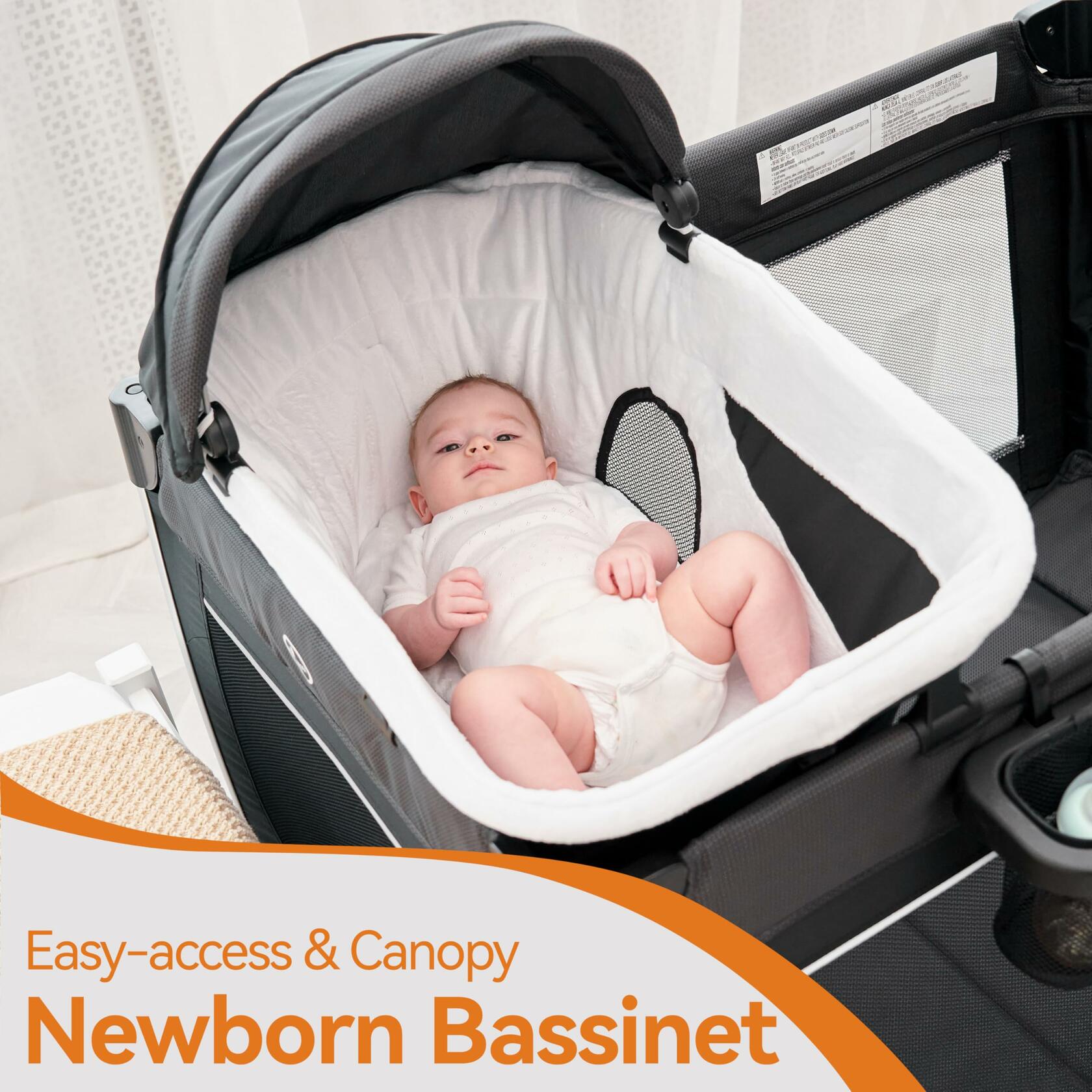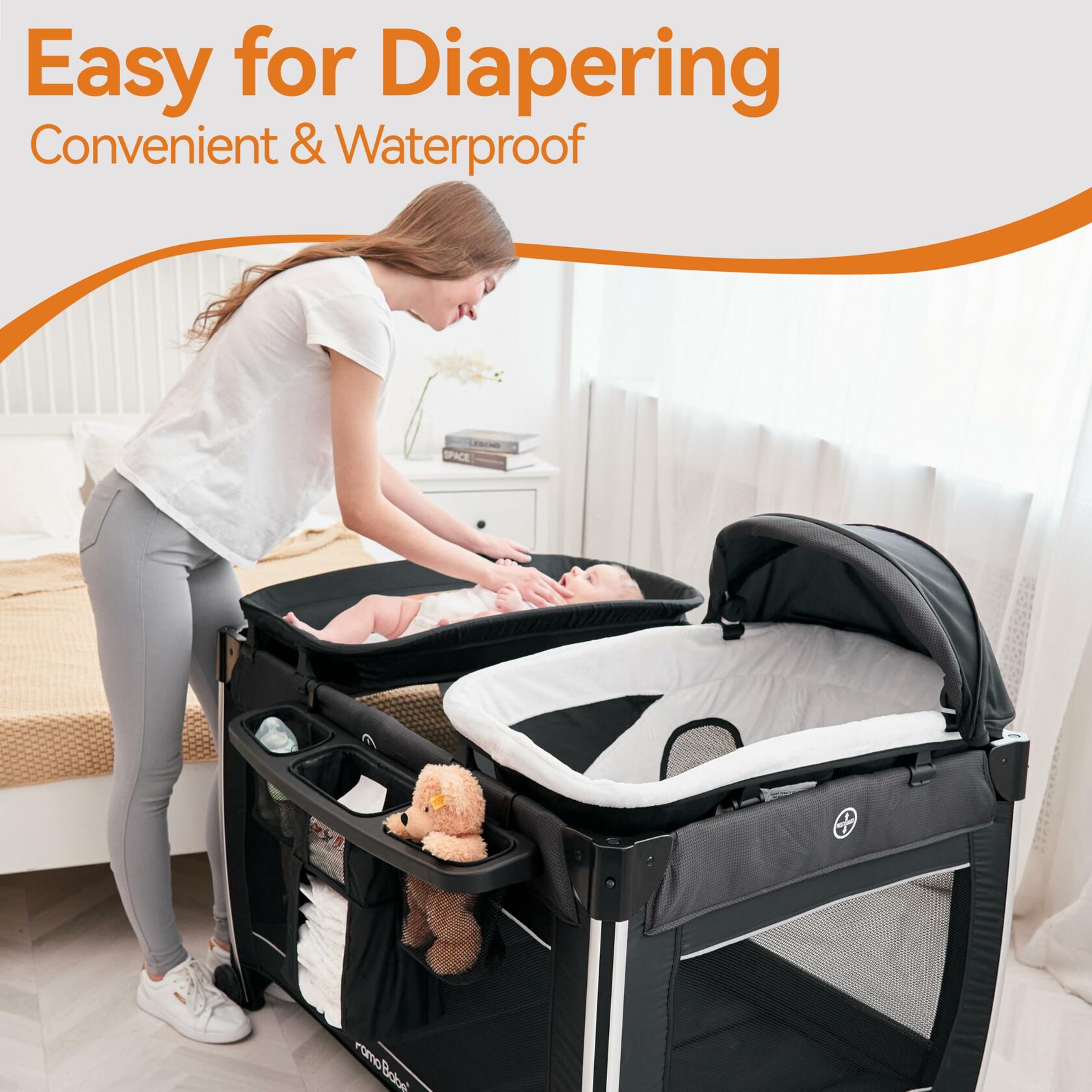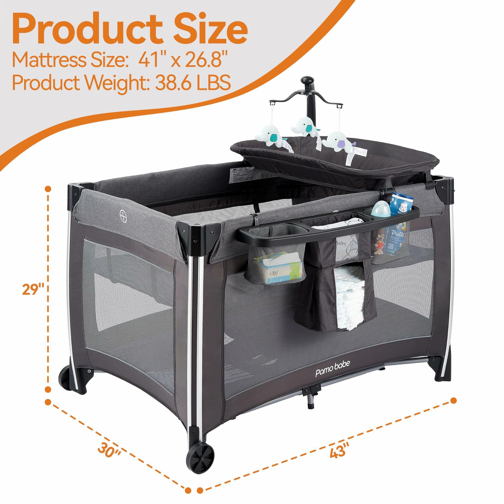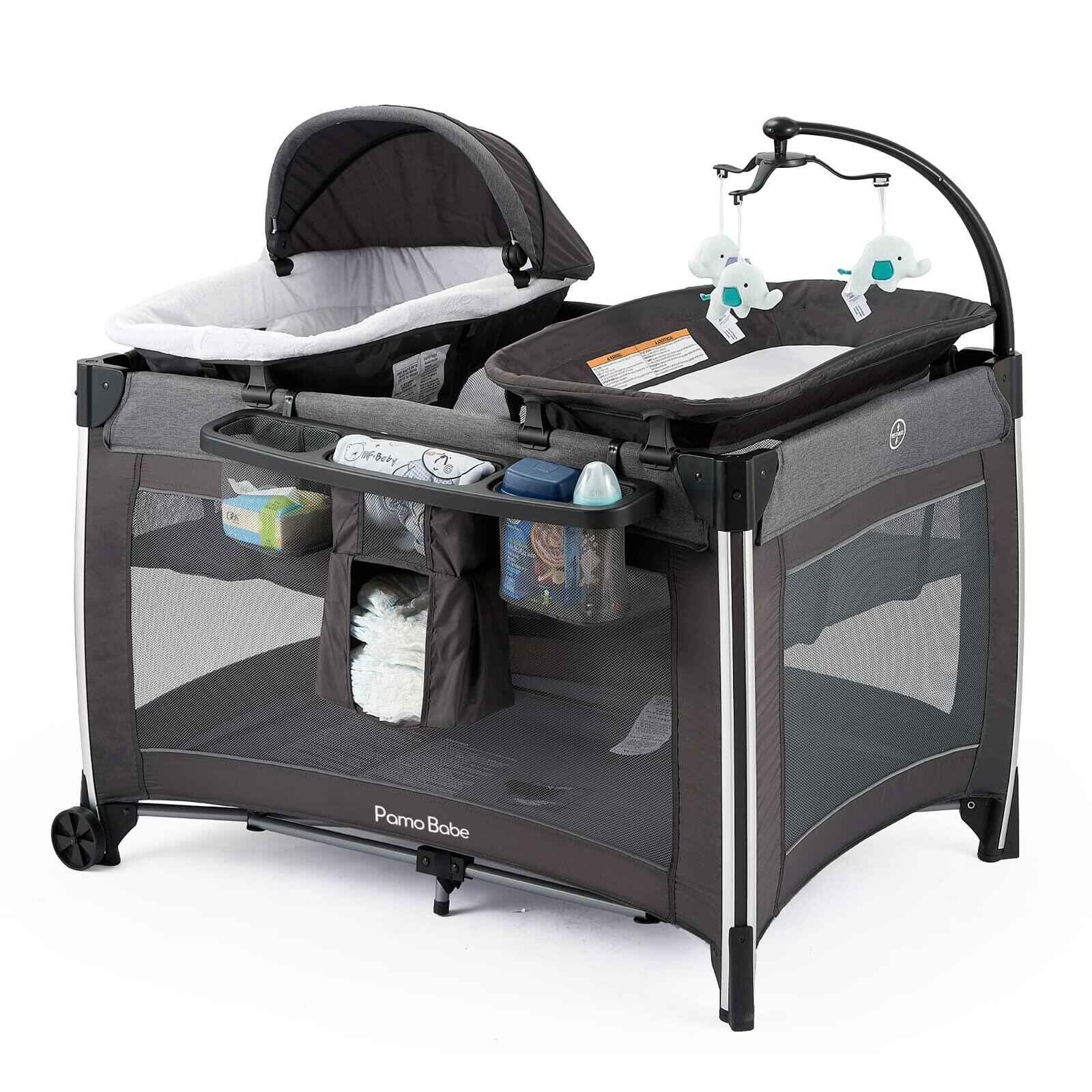 Pamo Babe 4 in 1 Portable Baby Crib Deluxe Nursery Center, Foldable Travel Playard with Bassinet, Mattress, Changing Table for Newborn, Infant, Toddler(Grey)