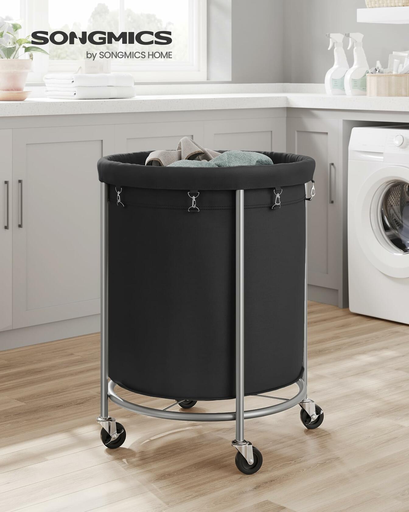 SONGMICS 50.2-Gallon (190 L) Laundry Basket with Wheels, Rolling Round Heavy-Duty Laundry Hamper Cart with Steel Frame and Removable Bag, 2 Locking Wheels, Ink Black and Metallic Silver URLS001B01